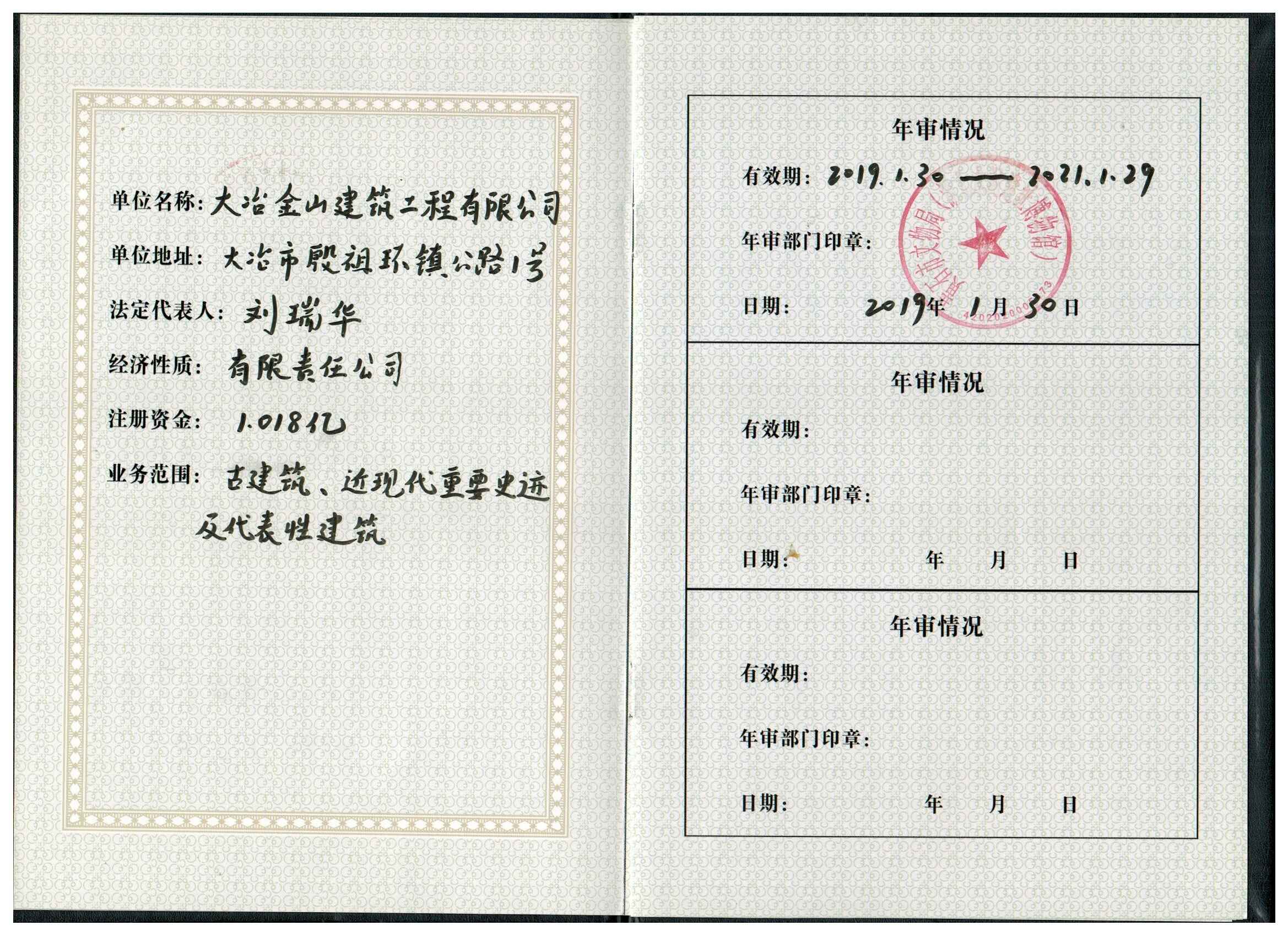 大冶金山建筑工程有限公司始建于1984年,屬鎮辦集體企業。1997年改制為大冶山建筑工程有限責任公司,屬股份制企業。2013年更名為大冶金山建筑工程有限公司,2018年3月公司資源重組,公司注冊資金達到10180.00萬元,公司法定代表人為劉瑞華。公司具有古建筑工程專業承包壹級、建筑工程施工總承包貳級、市政工程總承包叁級、鋼結構工程專業承包叁級資質。